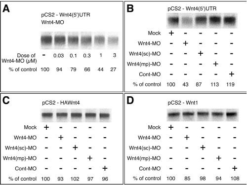 FIG. 3. Inhibition of Xenopus Wnt-4 translation in vitro by Wnt-4 antisense morpholinos. Plasmids (50 ng) encoding Wnt-4, HAWnt-4, and Wnt-1 were used as templates in cell-free coupled transcriptionranslation reactions. Several morpholinos [Wnt4-MO; sense control, Wnt4(sc)-MO; four-mispaired control, Wnt4(mp)-MO; and a standard control, Cont-MO] were tested for inhibition of translation. Cell-free transcriptionranslation reactions were performed in the presence of [35S]methionine and analyzed by SDSAGE/autoradiography. (A) Dose-response analysis of inhibition of Wnt-4 translation by Wnt4-MO. The amount of radiolabeled protein produced was quantified by using a phosphorimager. The control sample, which was not treated with Wnt4-MO, was set at 100%. Significant reduction of protein synthesis occurred with 1 and 3 M Wnt4-MO. (B) Sequence-specific inhibition of Wnt-4 translation by Wnt4-MO. Morpholinos (1 M) were used to inhibit translation of Wnt-4. Only Wnt4-MO was effective in blocking Wnt4 translation. (C, D) In vitro translation of HAWnt4 (an HA-tagged Wnt-4 variant lacking the complementary target sequence for Wnt4-MO) and Xenopus Wnt-1 was essentially unperturbed in the presence of Wnt4-MO. Morpholinos were used at 1 uM.
