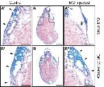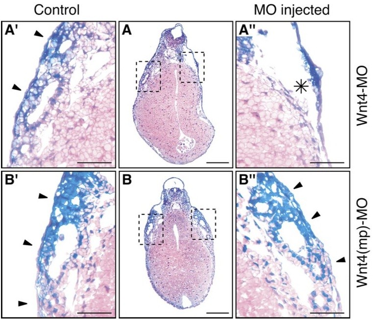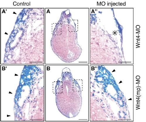 FIG. 7. Disruption of pronephric tubule formation by Wnt4-MO injection. Single V2 blastomeres of eight-cell-stage embryos were injected either with 5 ng Wnt4-MO (A) or Wnt4(mp)-MO (B). cytBgal mRNA (0.1 ng) was coinjected to allow identification of the MO-injected side. Embryos were fixed at stage 33/34, processed for cytBgal activity, and hybridized for SGLT-1L expression. Transverse sections (A, 1.5 um; B, 3 um) of plastic-embedded embryos were cut at the level of the pronephros. Selected sections counterstained with Toluidine Blue and basic fuchsine (A, B) are shown with enlargements of the pronephric tubule region of control (A', B') and injected (A, B) sides. (A', B') Well-developed pronephric tubule epithelia (arrowheads) were present on the control sides. (A) In contrast, no pronephric tubules could be detected when Wnt4-MO was injected. An asterisk indicates the position where tubules would normally form. (B) Injection of Wnt4(mp)-MO did not affect development of pronephric tubules (arrowheads). Scale bars: 250 um (A, B); 75 um (A', A, B', B).