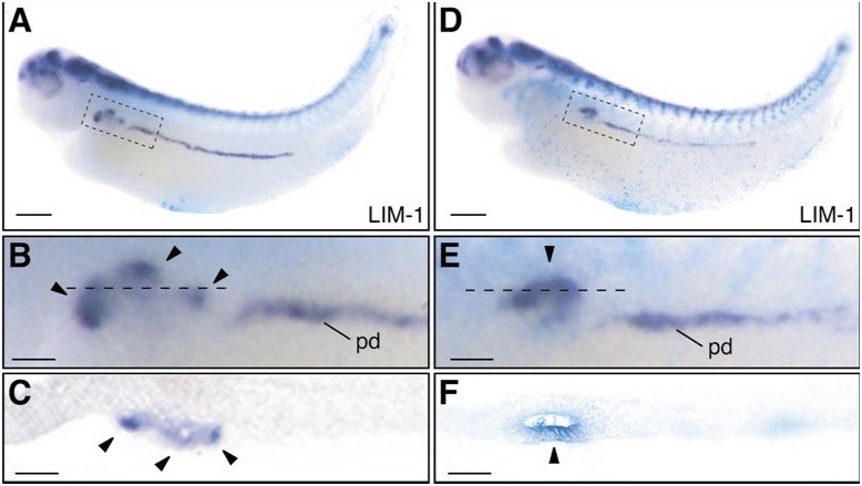 Fig. 6. Coinjection of HAWnt-4 rescues SGLT-1L expression in Wnt4-MO-treated Xenopus embryos. Single V2 blastomeres of eight-cell stage embryos were injected with 5 ng Wnt4-MO alone (A) or in conjunction with 0.25 ng HAWnt-4 mRNA (B, C). Cytoplasmic beta-galactosidase mRNA (cytBgal; 0.1 ng) was coinjected as a lineage tracer. Tailbud embryos (stage 33/34) were processed for Beta-gal activity and hybridized with antisense SGLT-1L probes. (A) Injection of 5 ng Wnt4-MO abolishes pronephric expression of SGLT-1L. The enlargement of the pronephric tubule region shows the presence of Beta-gal-expressing cells (pale blue), but absence of SGLT-1L transcripts. (B) Control side of an embryo coinjected with Wnt4-MO and HAWnt-4 mRNA. The inset illustrates normal SGLT-1L expression in the pronephros. (C) Injected side of the embryo shown in (B). The enlargement of the bordered area reveals substantial expression of SGLT-1L in the pronephros. Note that Beta-gal-expressing cells (arrowhead) are adjacent or colocalize with SGLT-1L-expressing cells (arrow). Scale bars: 600 um (A); 120 um (insets).
