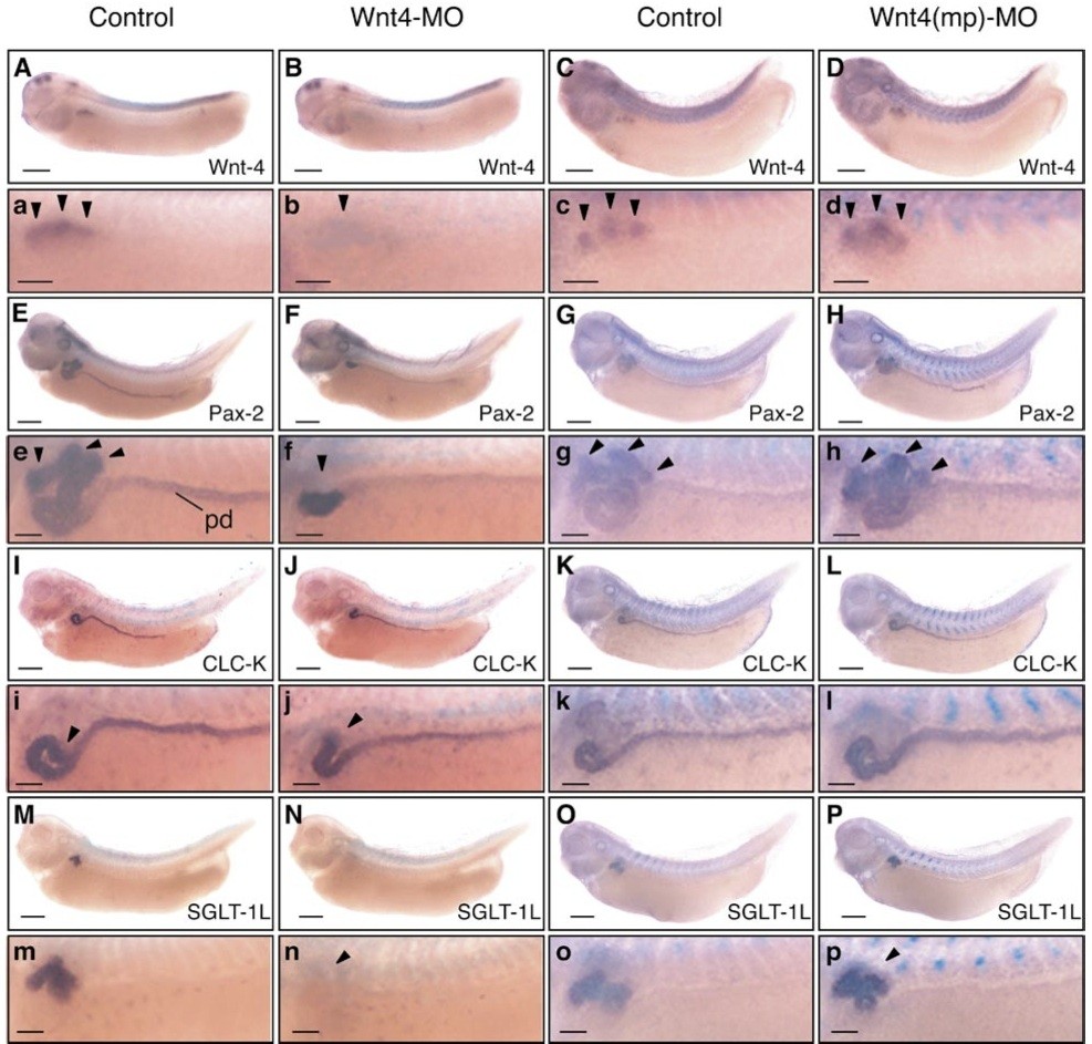 FIG. 5. Down-regulation of pronephric tubule-specific gene expression caused by injection of Wnt4-MO. Coinjections of 5 ng morpholinos [Wnt4-MO: B, F, J, N; or Wnt4(mp)-MO: D, H, L, P] and the lineage tracer cytBgal (0.1 ng) were performed into single V2 blastomeres at the eight-cell stage. Injected embryos were fixed at stages 29/30 (A) or 33/34 (E) and processed for Beta-gal activity. Expression of various marker genes was visualized by whole-mount in situ hybridization. Embryos with control and injected sides, respectively, are shown accompanied by enlargements of the pronephric region (a). (A) Injection of Wnt4-MO resulted in specific down-regulation of nephrostomal Wnt-4 expression (arrowheads), whereas injection of Wnt4(mp)-MO did not affect Wnt-4 expression. (E) Absence of discernable tubular Pax-2 expression (arrowheads) was observed in Wnt4-MO, but not in Wnt4(mp)-MO injected embryos. Expression of Pax-2 in the pronephric duct (pd) was largely unaffected by injection of either MO. (I) Pronephric expression of CLC-K is essentially normal in MO-injected embryos. Reduced coiling of the anterior duct portion (arrowhead), however, is observed with Wnt4-MO-injected embryos. (M) Injection of Wnt4-MO, but not Wnt4(mp)-MO, abolishes SGLT-1L expression (arrowhead). Scale bars: 400 um (A); 120 um (a).