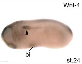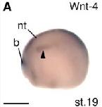 FIG. 1. Wnt-4 is expressed in the pronephric anlage and pronephric tubules. Wnt-4 transcripts were detected by whole-mount in situ hybridization. (A, F) Lateral views of Xenopus embryos with anterior to the left. (A) Wnt-4 expression in the pronephric anlage (arrowhead) of a stage 19 embryo. Expression is also present in the brain (b) and neural tube (nt). (B) At stage 24, Wnt-4 expression is prominently detected in the pronephric tubule anlage (arrowhead) and the ventralblood islands (bi). (C) At stage 32, Wnt-4 expression was associated with the pronephric tubules. Inset shows an enlargement of the pronephros with the three nephrostomes (arrowheads). Other regions with Wnt-4 expression include visceral arches (va), the neural tube, and discrete sections of the mid- and hindbrain (mb, hb). (D, E) Sections of stage 24 (D) and 32 (E) embryos hybridized in whole mount with Wnt-4 antisense probes. Embryos were embedded in agarose and transverse sections (30 ï°m) were cut at the level of the developing pronephric kidney. Sections are oriented with dorsal to the top. (D) Wnt-4 expression was detected in the pronephric anlage (pa) and neural tube (nt). The inset shows an enlargement of Wnt-4 expression in the somatic layer (so) of the intermediate mesoderm. The splanchnic layer (sp) and endoderm (ed) are devoid of any expression. (E) Wnt-4 expression is associated with the developing pronephric tubules (pt) and the floor plate (fp). The inset shows a close-up view of Wnt-4 expression in the pronephric tubules. (F) A stage 32 embryo stained for Pax-2 expression to visualize the pronephric kidney with tubules (arrowheads) and duct (pd) is shown for comparative purposes. Scale bars: 600 ï°m (A, B, C, F); 200 ï°m (inset in C); 140 ï°m (D, E); 40 ï°m (insets in D, E).