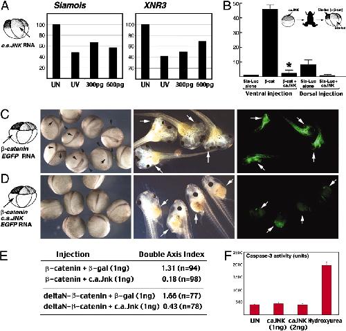 Fig. 3.JNK activation inhibits β-catenin-induced transcription and axis formation. (A) Injection of 300â600 pg of constitutive-active Jnk mRNA into the dorsal marginal zone of four-cell Xenopus embryos reduces the Siamois and Xnr3 expression in stage-10 embryos, similar to the effect of UV irradiation at the one-cell stage. UN, uninjected. (B) Injection of 1.5 ng of active Jnk mRNA into oocytes decreases the expression of luciferase at stage 10 after ventral coinjection of β-catenin mRNA and Sia-luc plasmid (*, P = 0.0059 using t test) or dorsal injection of Sia-Luc plasmid into host-transfer embryos (P = 0.2 using t test) at the four-cell stage. (C and D) Axis duplication assay by ventral injection of EGFP (300 pg) and β-catenin (1 ng) with either β-gal (1 ng) or active Jnk mRNA (1 ng) into four-cell Xenopus embryos. The progeny of β-catenin/β-gal-injected blastomere populate the ectopic axis (arrow in C), but those of β-catenin/active Jnk-injected blastomore develop into endodermal tissues (arrow in D). (E) Coinjection of 1 ng active Jnk mRNA blocks axis duplication induced by ventral injection of WT β-catenin (40 pg) or stabilized δN-β-catenin (7.5 pg). (F) Hydroxyurea (30 mM)-treated, but not active Jnk mRNA (2 ng)-injected embryos had increased caspase-3 protease activity. (Magnifications: C and D, Ã10.) |