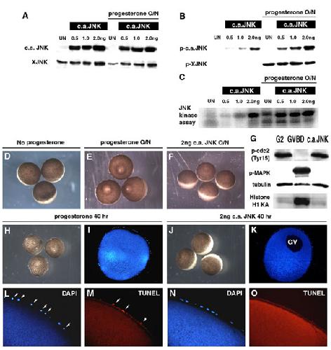 Fig. 6. JNK activation does not induce the maturation or degeneration of Xenopus oocytes. (A-C) Oocytes injected with 0.5-2.0 ng FLAG-tagged MKK7-hJNK1 (c.a. JNK) mRNA were compared with uninjected oocytes for the expression of total JNK protein (A), phosphorylated-JNK (B), and JNK activity (C) after over-night (O/N) culture in the presence or absence of progesterone. Injection of c.a. JNK causes constitutive JNK activity in the oocytes without progesterone stimulation. (D-F) External morphology of nonstimulated (D), progesterone-stimulated (E), and c.a. JNK injected oocytes (F) after overnight culture. Note only progesterone-treated oocytes exhibit white spots in the animal poles indicting germinal vesicle breakdown (GVBD). (G) Biochemical analysis showed the injection of c.a. JNK mRNA does not lead to a GVBD-like signaling profile including dephosphorylation of Cdc2, phosphorylation of p42 MAPK/ERK, and induction of the histone H1 kinase activity. (H-O) Comparison of the viability of oocytes after 40-h incubation with progesterone (H, I, L, and M) or JNK stimulation (J, K, N, and O). Prolonged progesterone stimulation led to clumping of follicular cells (H and I). DAPI (L) and TUNEL (M) stains showed nuclear condensation and DNA fragmentation of the follicular cells. In contrast, none of these events were observed after prolonged JNK stimulation. |