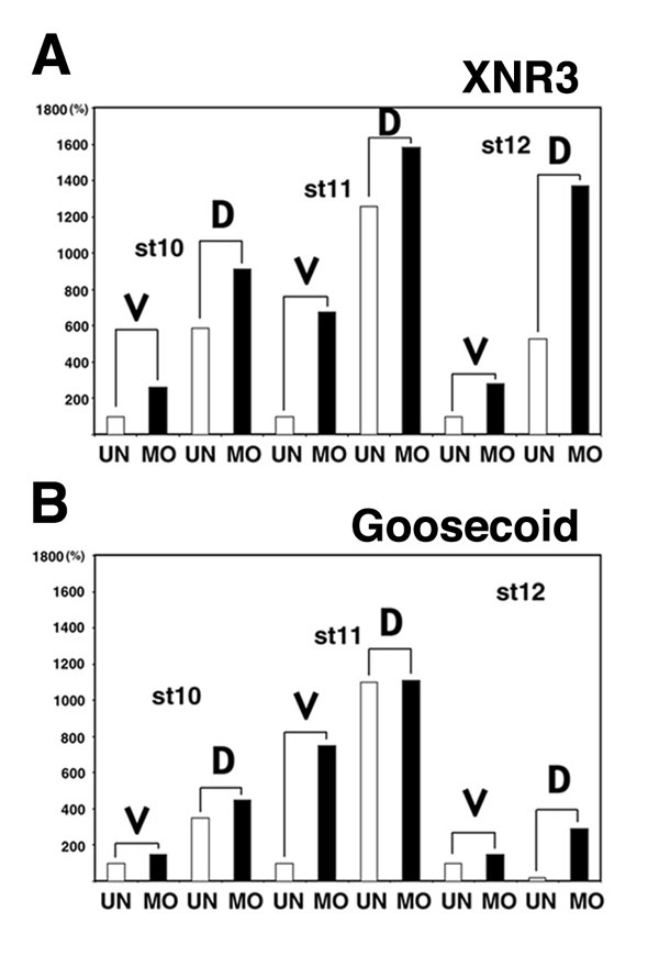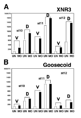 Fig. 7. Knockdown of JNK induces ectopic expression of the dorsal marker genes XNR3 and Goosecoid. The expression of the dorsal marker genes Xnr3 (A) and Goosecoid (B) are increased in both ventral (V) and dorsal (D) halves of embryos injected with 30 ng of JNK MO antisense oligo at indicated stages of development. |