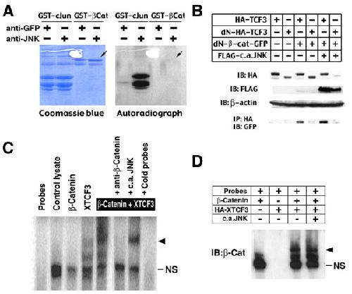 Fig. 9. JNK does not phosphorylate b-catenin nor interfere with its physical binding to the LEF/TCF transcription factors. (A) Immuno-precipitated JNK from Xenopus embryos phosphorylates GST-c-Jun, but not GST-b -catenin (arrow). The protein input was shown by Coomassie blue stain, and anti-GFP immunoprecipitates were used as negative controls. (B) Association of HA-TCF3 and dN-b-catenin-GFP was assessed by immunoprecipitation after cotransfection with constitutive-active JNK in HEK293T cells. HA-TCF3 lacking the b-catenin-interacting domain (D N-HA-TCF3) was used as negative controls for immunoprecipitation. This assay showed that JNK does not interfere with the association of HA-TCF3 and DN-b -catenin-GFP. (C) Gel-shift assay was used to assess the effect of active JNK on b -catenin-XTCF3 binding on an optimal Tcf/Lef probe (TOPFLASH). In vitro translated b-catenin, HA-XTCF3 and active-JNK were used in the assay. The radiolabled TOPFLASH probe band was retarded by XTCF3 and supershifted by addition of b-catenin (arrowhead). The b-catenin/XTCF3/DNA complex was disrupted by addition of anti-b-catenin antibody or competitive cold probes, but not by constitutive-active JNK. A nonspecific band (NS) is due to binding between the probe and endogenous proteins in the in vitro translation system (see the control lysate lane). (D) The association of b-catenin and XTCF3 on the Tcf/Lef probe is examined by sequential gel retardation and immunoblotting analysis against b-catenin (Shift-Western assay). The presence of both b-catenin and XTCF3 causes a shift of the electrophoretic mobility indicating the formation of b-catenin/XTCF3/DNA complex (arrowhead) that is not disrupted by constitutive-active JNK. |
