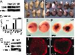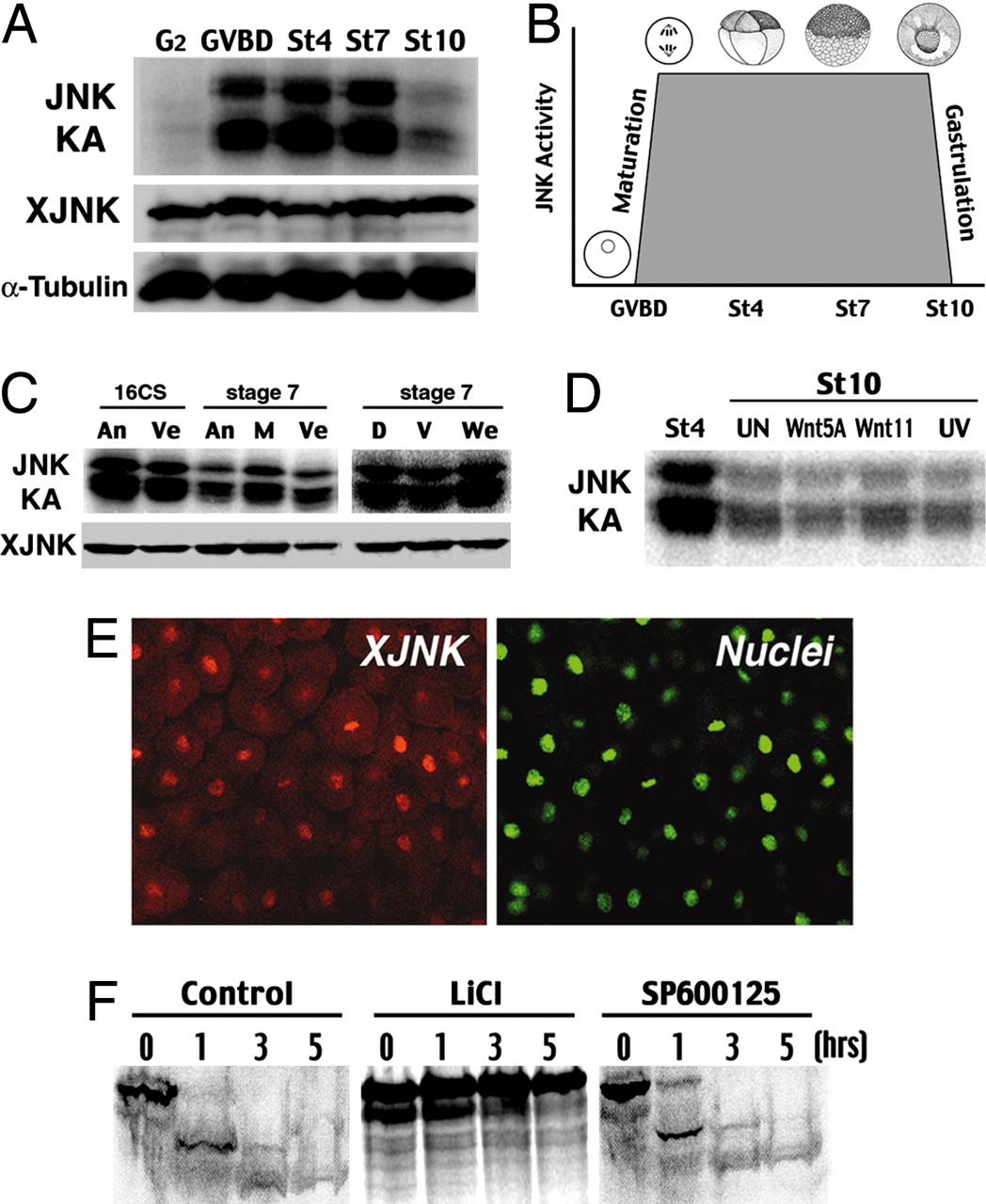 Fig. 1.Characterization of maternal JNK signaling in Xenopus embryos. (A) The kinase assay (KA) shows a rapid rise of JNK activity during germinal vesicle breakdown (GVBD) that lasts until stage (St) 10 despite a constant level of JNK protein expression. XJNK, Xenopus JNK. (B) Schematic diagram of maternal JNK signaling during early Xenopus development. (C) Dissecting 16-cell (16CS) and stage-7 embryos shows no obvious regionalization of JNK activity. An, animal half; Ve, vegetal half; M, marginal zone; D, dorsal half; V, ventral half; We, whole embryo. (D) UV irradiation of one-cell Xenopus embryos or injection of Wnt5A or Wnt11 mRNA at the four-cell stage did not prevent the decline of JNK activity at stage 10. (E) Immunostaining shows that JNK is concentrated in the nucleus in stage-8 Xenopus embryos. The nucleus is counterstained with SYTOX green dye. (Magnification: Ã6,300.) (F) The addition of lithium chloride (25 mM) effectively blocks β-catenin degradation in an in vitro assay using the Xenopus egg extracts. In contrast, the addition of JNK inhibitor SP600125 (20 μM) does not prevent β-catenin degradation. |