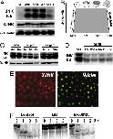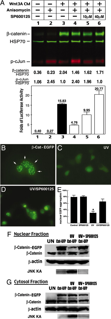 Fig. 4. JNK activation expels nuclear β-catenin. (A) L cells transfected with the superTOPFLASH plasmid were treated with Wnt-3A conditional medium (CM), anisomycin (67 ng/ml), and/or a JNK inhibitor, SP600125 (10, 40 μM), to assess the effect of JNK signaling activation (indicated by the phospho-cJun level on the immunoblot) on the protein level of β-catenin (normalized to HSP70) and β-catenin/TCF-mediated gene expression (folds of the fireflyluceferase activity normalized to the Renilla luciferase activity) at 24 h after various treatments. Quantification of the β-catenin/HSP70, phospho-cJun/HSP70 ratios, and the folds of luciferase activity are shown as the average and SD from three sets of independent experiments. (BâD%) Transfection of β-catenin-EGFP plasmid to COS-1 cells caused fluorescent aggregates in the nucleus (B), which were eliminated after UV irradiation (100 J/m2) (C) but were retained inside the nucleus by application of JNK inhibitor SP600125 (10 μM) after UV irradiation (D). (E) The percentage of β-catenin-EGFP-expressing COS-1 cells that have prominent nuclear aggregates in control (79.3% ± 5.1%; mean ± SD), SP600125 alone (80.5% ± 3%), UV irradiation (31.8% ± 5.7%), and UV irradiation with SP600125 (66% ± 7.4%) in three sets of experiments. *, P < 0.0001 versus the rest with a t test. (F and G) The nuclear and cytosol fractions of HEK293T cells after transfection with β-catenin-EGFP plasmids were examined by immunoblots to quantify the effect of UV-induced nuclear β-catenin and JNK kinase activity (KA). Anti-β-actin was used as a control for protein loading. This analysis shows UV causes a JNK activity-dependent depletion of nuclear β-catein-EGFP. Shown is representative result from three sets of independent experiments. UN, uninjected. (Magnifications: BâD%, Ã4,000.) |