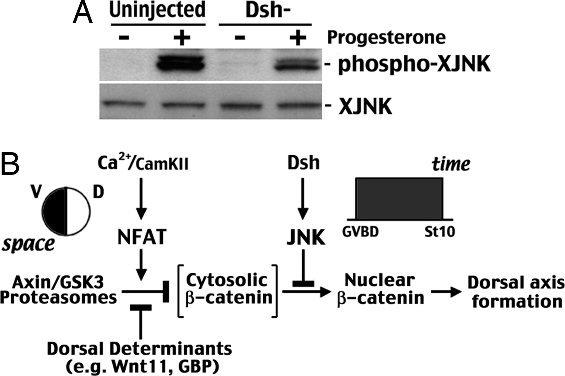 Fig. 5. Maternal JNK is activated through Dsh and provides temporal regulation of canonical Wnt/β-catenin signaling for axis formation in Xenopus. (A) Oocytes injected with antisense oligos against Dsh (Dshâ) still undergo germinal vesicle breakdown, but have a reduced level of JNK phosphorylation and activity as shown in this representative blot from three independent experiments. XJNK, Xenopus JNK. (B) Summary of the results from the present study and the literature to illustrate how Dsh/JNK and Ca2+/CamKII/NFAT provide temporal and spatial restriction of the canonical Wnt/β-catenin pathway, respectively, for axis formation in early Xenopus development. CamKII, camodulin kinase II; GVBD, germinal vesicle breakdown. |