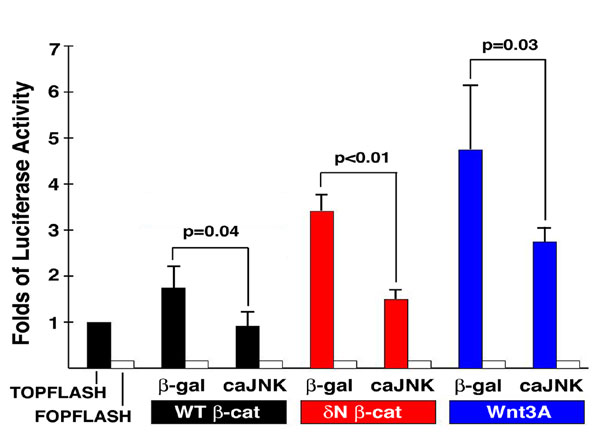 Fig. 8. JNK inhibits b -catenin/TCF-mediated transcription in the mammalian cells. Cotransfection of constitutively-active JNK plasmid reduces the WT and stabilizes (dN) b-catenin-induced, or Wnt3A-stimulated Luciferase expression from the TOPFLASH, but not TOPFLASH DNA, in HEK293T cells. The results were normalized to the Renilla luciferase activity and averaged from three sets of independent experiments. |
