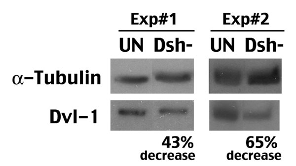 Fig. 10. Knockdown of Dsh in Xenopus oocytes with antisense oligos. Shown are results from two batches of oocytes. The intensity of Dsh was quantified using NIH Image J program and normalized to that of a-tubulin.