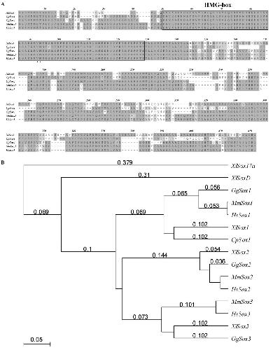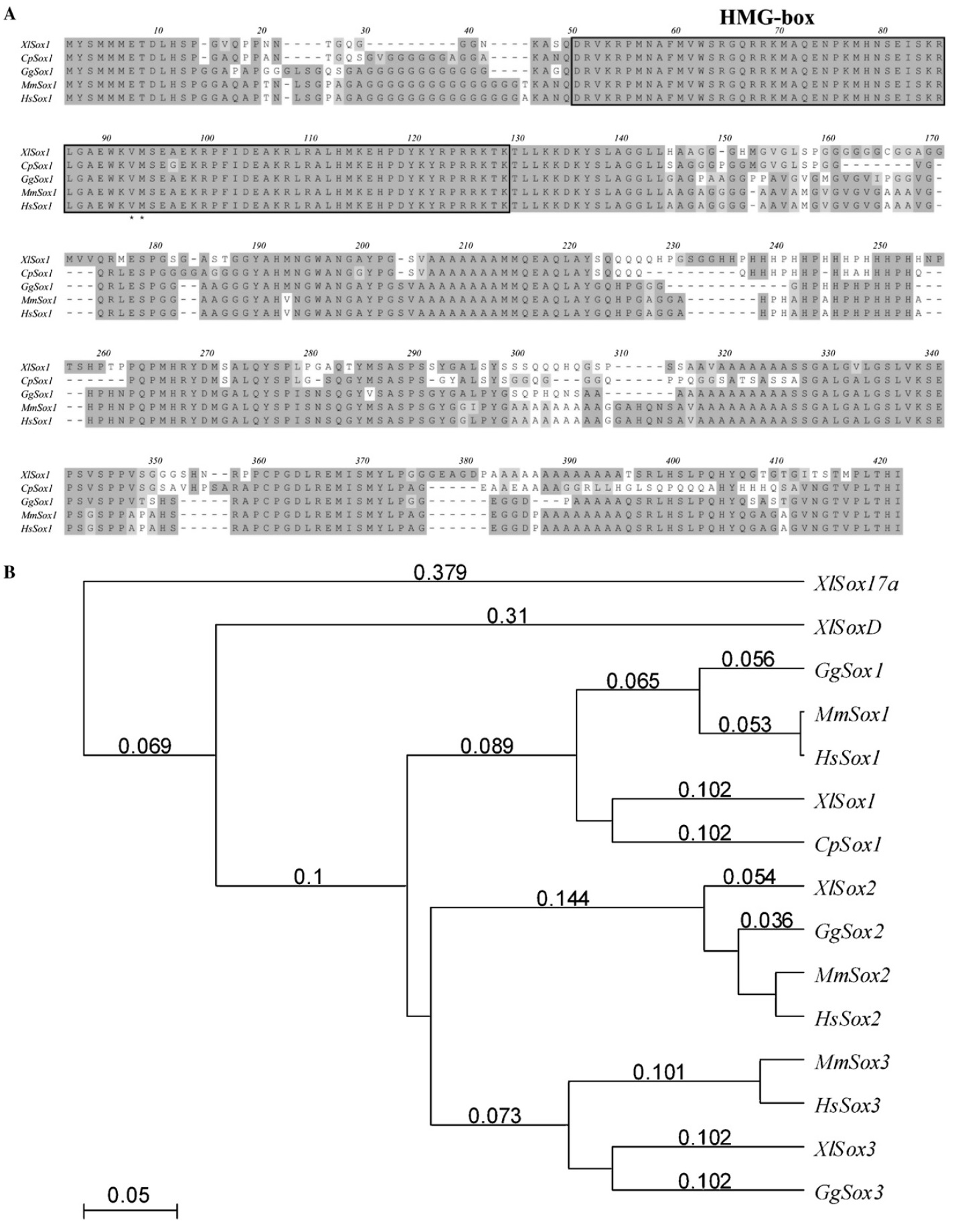 Fig. 1. (A) Alignment of Sox1 amino acid sequences in various species. Identical amino acids are shaded in gray, and conserved amino acid substitutions