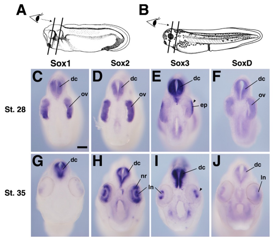in the eye (G). Sox2 and SoxD were expressed in the diencephalon, the neural retina, and the lens (H,J). Sox3 was expressed in the diencephalon and the