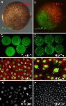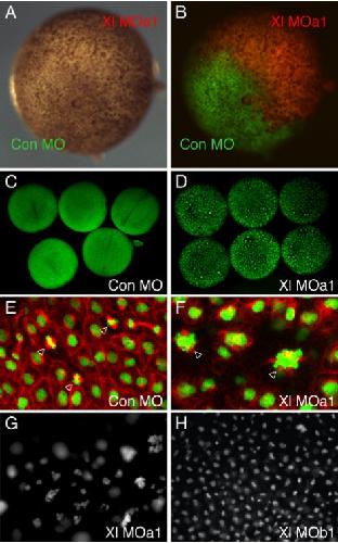 Fig. 3. Antisense morpholino oligonucleotide Xl MOa1 causes defects in nuclear division. (A, B) One cell of an X. laevis embryo at the two-cell stage was injected with 40 ng control MO together with fluorescein-dextran (green), and the other cell was injected with Xl MOa1 together with rhodamine-dextran (red). Note that Xl MOa1 causes retardation of cell division. (C, D) By neurula stage 14, embryos injected with Xl MOa1 have many fewer cells than control embryos and larger nuclei. DNA is stained with SYTOX green. (C) Embryo previously injected at the one-cell stage with 80 ng control MO. (D) Embryo injected with 80 ng Xl MOa1; note the smaller number of much larger nuclei. (E, F) Higher magnification of cells in the animal pole regions of such embryos at mid gastrula stage 11. DNA is stained by SYTOX green and tubulin by means of an antibody against β-tubulin (red). (E) Embryo injected with 80 ng control MO. Note normal metaphase figures (arrowheads). (F) Embryo injected with Xl MOa1. Note mitoses with multiple spindles (arrowheads). (G, H) In a separate experiment, embryos injected with 80 ng Xl MOa1 also show abnormal mitosis (G), but cells in an embryo injected with the same amount of Xl MOb1 appear normal. |