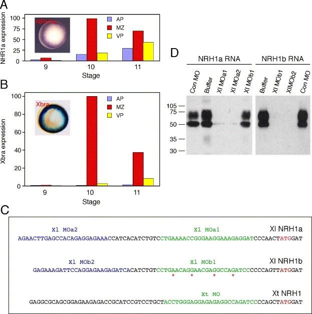 Fig. 1. Expression pattern of NRH1a and the design of NRH1 antisense morpholino oligonucleotides (MOs). (A) Expression pattern of NRH1a. RNA was extracted at the indicated stages from animal pole (AP), marginal zone (MZ) and vegetal pole (VP) regions, and the expression of NRH1a and ornithine decarboxylase (ODC) was analysed by real-time RT-PCR and normalised to levels of total RNA, with maximum observed expression defined as 100. Note significant levels of NRH1a expression in animal and vegetal pole regions. The inset shows expression of NRH1a at early gastrula stage 10 analysed by in situ hybridisation. There are high levels of NRH1a expression in the marginal zone, as previously reported (Bromley et al., 2004). (B) Expression pattern of Xbra, analysed and normalised as described for (A). Note that expression of this gene in animal pole and vegetal pole regions is lower than that of NRH1a. (C) The design of antisense morpholino oligonucleotides directed against NRH1 gene products in X. laevis and X. tropicalis. The initiating ATGs of X. laevis NRH1a and NRH1b and of X. tropicalis NRH1 are shown in red, preceded by their 5â² untranslated sequences. The sequences targeted by the indicated antisense morpholino oligonucleotides are coloured blue or green. A control MO differs by four bases (starred) from Xl MOb1. (D) Efficacies of the antisense morpholino oligonucleotides. Embryos were injected with 40 ng of the indicated MOs at one-cell stage, and 500 pg RNA encoding HA-tagged versions of NRH1a or NRH1b was injected at the two-cell stage. Embryos were cultured until mid blastula stage 8, and extracts were subjected to western blotting using an anti-HA antibody. All four X. laevis MOs block the translation of their cognate RNA while the control MO has little or no effect. |