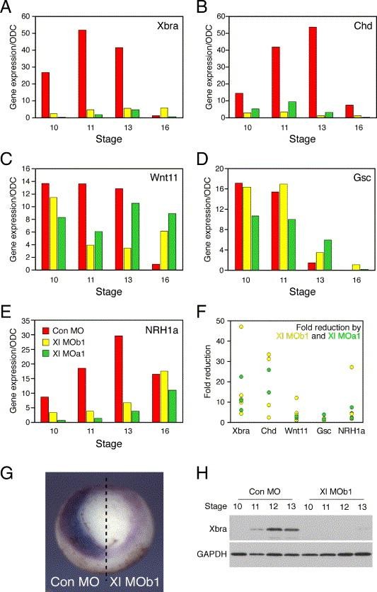 Fig. 6. Gene expression in embryos lacking NRH1 function. (AâE) Xenopus embryos were injected at the one-cell stage with 80 ng of a control MO or of Xl MOa1 or Xl MOb1. They were then assayed by real-time RT-PCR at stages 10, 11, 13 or 16 for expression of Xbra (A), Chordin (B), Xwnt11 (C), Goosecoid (D) or NRH1a (E). All values were normalised to those of ornithine decarboxylase and are presented as arbitrary units. Note that levels of Xbra, Chordin and NRH1b are substantially reduced by inhibition of NRH1 activity. (F) Scatter graphs summarising the results of four independent experiments investigating gene expression levels in embryos in which NRH1 activity is inhibited. The results show the fold reduction in gene expression caused by NRH1 MOs (such that a value of 1 would indicate no difference between control embryos and embryos injected with Xl MO1a or Xl MOb1). The ratios were calculated at the stage at which each gene was expressed at its maximum level (for example, at stage 11 for Xbra and stage 13 for Chordin). (G) Xenopus embryos were injected at the two-cell stage with 40 ng control MO into one blastomere and 40 ng Xl MOb1 into the other. The control and experimental sides of the embryos were distinguished by co-injection of 4 ng Lissamine-labelled control MO or fluorescein-labelled control MO. Embryos were allowed to develop to early gastrula stage 10 when they were analysed by in situ hybridisation using a probe specific for Xbra. Note that levels of Xbra are lower in the descendants of the blastomere injected with Xl MOb1 (right). Nine experiments of this kind have been carried out, together with five where one side of the embryo was injected with Xl MOb1 and the other left uninjected and six where one side of the embryo was injected with control MO and the other left uninjected. Only in the latter group were levels of Xbra similar in the two halves of the embryo. (H) Western blot of extracts from embryos injected at the cell stage with 80 ng of a control MO or Xl MOb1, probed with an antibody specific for Xbra (upper panel) or GAPDH (lower panel). Note that levels of Xbra are greatly reduced by inhibition of NRH1 protein function. |