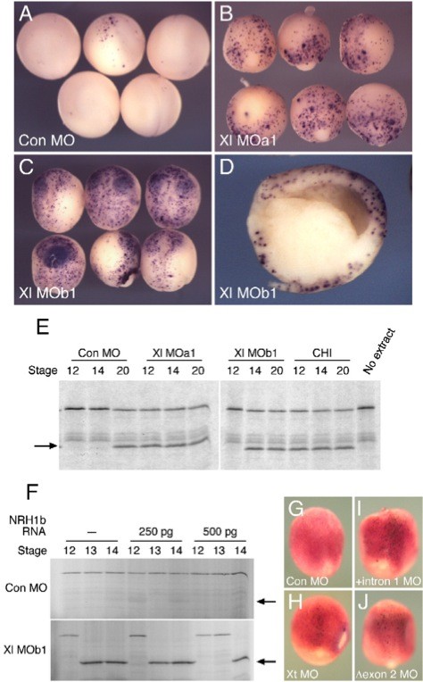 Fig. 5. Apoptosis in embryos injected with NRH1 MOs. (A) Whole-mount TUNEL assays of X. laevis embryos at stage 14 reveal low levels of apoptosis in embryos injected with 80 ng of a control MO and high levels in embryos injected with 80 ng Xl MOa1 (B) or Xl MOb1 (C). (D) An embryo injected with 80 ng Xl MOb1 and bisected at stage 14. Anterior is to the right. Note high levels of apoptosis in dorsal and ventral mesoderm and in ectoderm. (E) Apoptosis in Xenopus embryos analysed by a tPARP cleavage assay. Arrows indicate the major tPARP cleavage product, which indicates the presence of active caspases. Note that apoptosis is detectable in embryos injected with a control MO at stage 20, but occurs earlier in embryos injected with NRH1 MOs and, as a positive control, in embryos treated with cycloheximide (CHI). (F) The premature onset of apoptosis in embryos injected with Xl MOb1 is delayed by subsequent injection of 500 pg RNA encoding NRH1b. (G) Inhibition of NRH1 function in X. tropicalis also causes apoptosis. Embryos were injected with our control MO (G), with Xt MO (H) or with MOs designed to prevent correct splicing of NRH1 mRNA in X. tropicalis (I, J; see Fig. 7) and were analysed by TUNEL staining at stage 13. Note increased levels of apoptosis in panels H, I and J. This experiment has been carried out three times using Xt MO and once using +intron 1 MO and δexon 2 MO, with the same result obtained each time. |