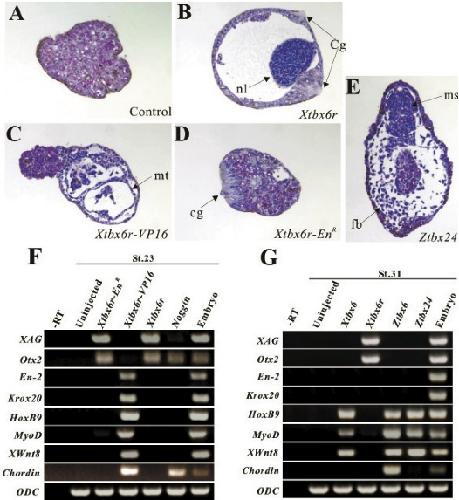 Fig. 7. Xtbx6r induces anterior neuroectodermal markers in animal cap explants. (A-E) Histological sections of animal cap explants at st.31. Injected mRNA and its doses were: (A) uninjected control, (B) Xtbx6r (200 pg), (C) Xtbx6r-VP16 (200 pg), (D) Xtbx6r-EnR (200 pg), (E) Ztbx24 (200 pg). Cg, cement gland; fg, fibroblast; nl, neural-like tissue; ms, muscle; mt, mesothelium. (F-G) Animal cap explants were analyzed at st.23 (F) and at stage 31 (G) by RT-PCR. Injected mRNA and its doses were: (F) Xtbx6r (200 pg), Xtbx6r-EnR, Xtbx6r-VP16 and noggin (100 pg, respectively). (G) Xtbx6, Xtbx6r, Ztbx6 and Ztbx24 (200 pg, respectively).