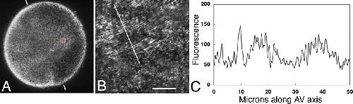 Fig. 8. Cortical microfilament bundles slide past each other, paralleling the direction of shear. (A) Equatorial view via confocal microscopy of an egg matured from an oocyte injected with GFP-actin mRNA. The egg was parthenogenetically activated and incubated in BDM/nocodazole. White bars indicate the orientation of the animal-vegetal axis. (B) The colorized region is examined at higher magnification, showing GFP-decorated microfilaments oriented in a band paralleling the equator. (C) The fluorescence intensity profile along a white transect in B paralleling the animal-vegetal meridian. The distribution of intensity maxima indicates relatively uniform spacing of GFP-actin microfilament bundles. Scale bar in B: 15 μm.