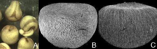 Fig. 10. Hyperdorsalization results from radialized vegetal microtubule array. (A) Embryos treated with 20 mmol/l BDM for 20 minutes during the first cell cycle displayed a range of conjoined-twin and radialized hyperdorsal morphologies. (B) A normal vegetal-cortical microtubule array, seen from the side in a whole-mount embryo immunostained forαβ -tubulin via confocal microscopy. The specimen is oriented with the animal pole up, sperm entry point to the right, and thus prospective dorsal to the left. (C) A vegetal-cortical microtubule array in a BDM-treated sibling displaying the extreme hyperdorsal phenotypes seen in A. The specimen orientation is the same as that for B.