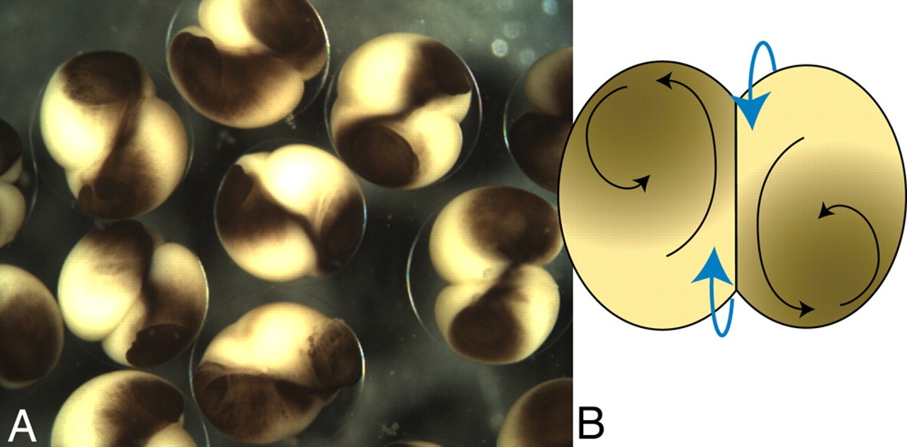 Fig. 1. BDM exposure late in the first cell cycle produces counterclockwise torsion of blastomeres during first cleavage. (A) Xenopus embryos were immersed in 20 mmol/l BDM at 75 minutes post-fertilization (0.83 NT). In every embryo, each blastomere rotates relative to the other in a counterclockwise direction, resulting in a characteristic chiral pattern. (B) The counterclockwise twisting of the pigmented animal cortex of each blastomere relative to the animal-vegetal axis of the embryo (black arrows) produces an invariably counterclockwise torsion between blastomeres as they cleave (blue arrows).
