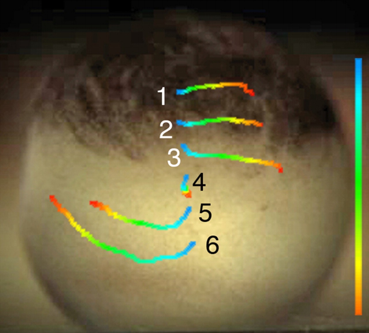 Fig. 6. A broad shear zone develops at the equator of BDM-treated activated eggs. The frame from a side-view time-lapse sequence spanning a 20 minute period at the beginning of torsion (see Movie S3 in the supplementary material). Motion of individual pigment granules (marks 1-6) traced via time-lapse is indicated by colored tracks. The colored bar indicates a 20 minute time interval (blue: start of tracking; red: +20 minutes).