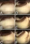 Fig. 4. Cortical torsion occurs in parthenogenetically activated eggs. (A-F) Eggs were parthenogenetically activated and, from 75 minutes post-activation (â¼0.79 NT) onward, bathed continuously in 20 mmol/l BDM. Activated egg, viewed from the side through two cleavage cycle equivalents (frames approximately 10 minutes apart), developed a spiraled pigment pattern in the animal hemisphere as the surface rotated left to right (counterclockwise).
