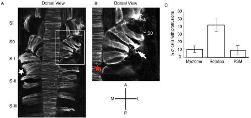 Fig. 4. Somite rotation is associated with anincrease in filopodial protrusions. A: Dorsalview of a stage 28 embryo in which the B1blastomere at the 32-cell stage was injectedwith mRNA encoding GAP43-GFP. The embryowas fixed, cleared, and mounted such that an-terior is to the top of the image. B: Close-up ofS0 (white box) showing the formation of filopo-dial protrusions that are posteriorly directed.Cells in the presomitic mesoderm (PSM) makebroad cell contacts with the adjacent notochord(red star). C: A graph representing the percent-age of cells with protrusions seen in the myo-tome (SI; n ⫽ 150 cells), rotating somites (S0;n ⫽ 159 cells), and PSM (S-I; n ⫽ 39 cells). GFP,green fluorescent protein.