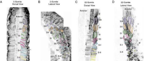 Fig. 5. Temporal differences associated withthe formation of anterior and posterior somites.A,B: Dorsal (A) and lateral (B) views of a fixedand cleared five-somite embryo (stage 19)show that somite rotation is relatively slow incomparison to segmentation (arrow) and that itis not complete until the somite matures to S-3.C,D: An older fixed and cleared embryo with 22somites (stage 28) scanned from both the dor-sal (C) and lateral (D) perspectives shows thatsomite rotation is coincident with segmenta-tion.