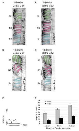 Fig. 7. Somite formation occurs in a dorsal-to-ventral progression.A,B: Comparison of cell shapes between a dorsal view at the level of theneural tube (A) and a ventral view at the level of the notochord (B) in thesame fixed, cleared, and green fluorescent protein (GFP) -labeled five-somite embryo (stage 19). C,D: In an older fixed, cleared, and GFP-labeled embryo (stage 27), during the formation of the 19th somite,dorsal (C) and ventral (D) differences in cell morphology become moreapparent. E: An illustration of cell angle measurements as cells in S0rotate 90 degrees to form myotome fibers. The angle of rotation wasmeasured for cells in S0 relative to the starting position of cells in thepresomitic mesoderm (PSM; S-I). F: A graph showing the angle ofrotation for individual cells within S0 at three different axial regions of thedeveloping paraxial mesoderm: (1) anterior, consisting of embryos with4 to 6 somites; (2) middle, consisting of embryos with 9 to 12 somites;and (3) posterior, consisting of embryos with 18 to 20 somites.
