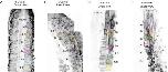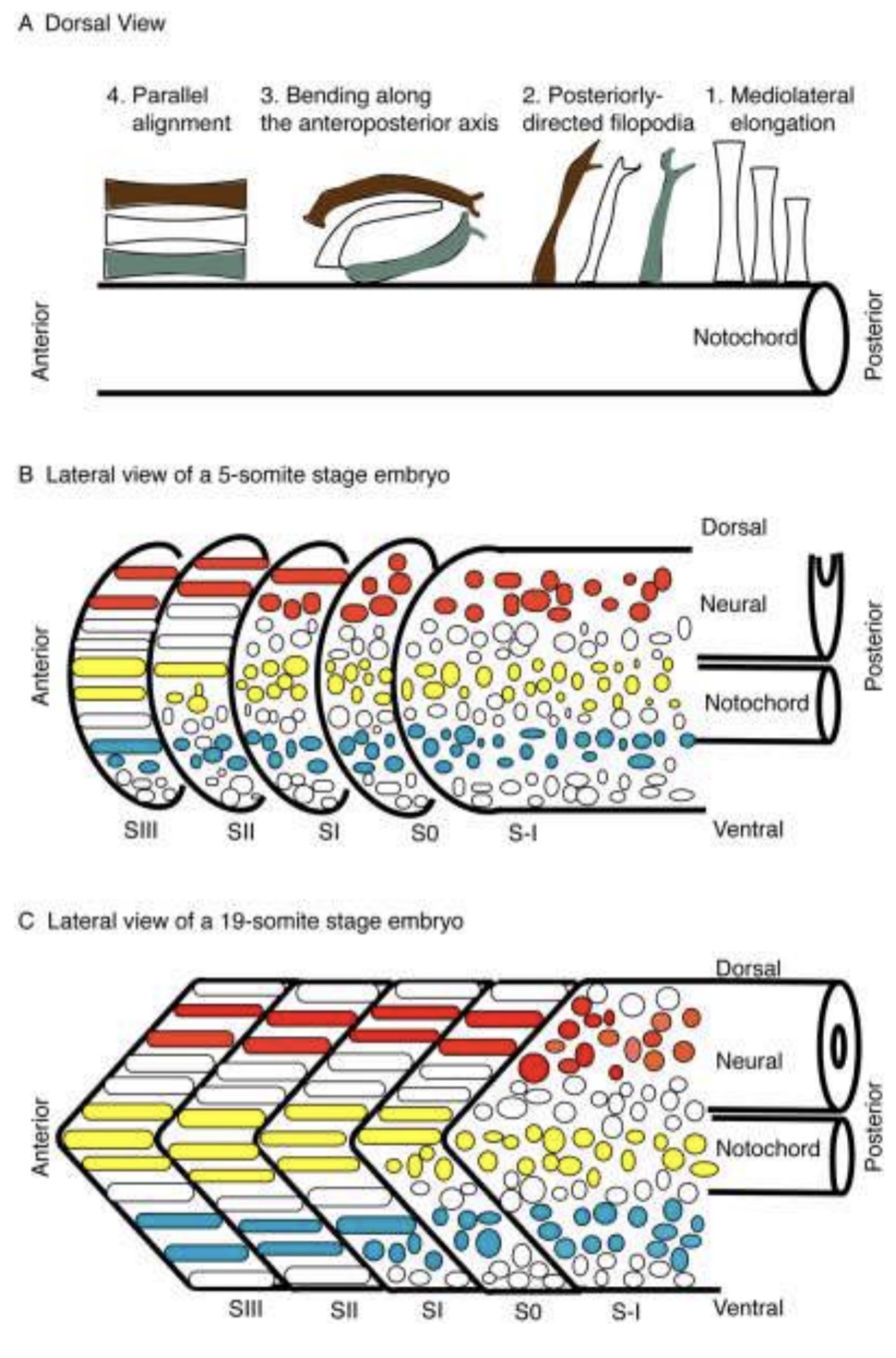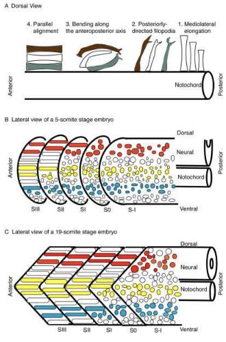 Fig. 8. Proposed four-step model for cell shape changes occurringduring somite morphogenesis. A1: Cells elongate mediolaterally in theanterior presomitic mesoderm (PSM; S-I). A2: The number of posteriorlydirected filopodial protrusions increases. A3: Elongated cells bendaround the dorsoventral axis such that the anterior cell moves to thelateral edge of the somite (shown in brown) and a more posterior cellmoves to the medial region of the somite (shown in gray). A4: Cellsachieve a parallel alignment along the anteroposterior axis. B: Theoverall pattern of somite morphogenesis occurs in a dorsal-to-ventralgradient. Colored cells indicate that movement occurs around the dor-soventral axis during somite segmentation and rotation. C: During theformation of posterior somites, rotation and formation (S0) occur simul-taneously, such that cells positioned in the dorsal (red) and middle(yellow) regions of the somite have completed rotation. Thus by the timethe somite matures to SI, almost all of the cells have completed rotation.