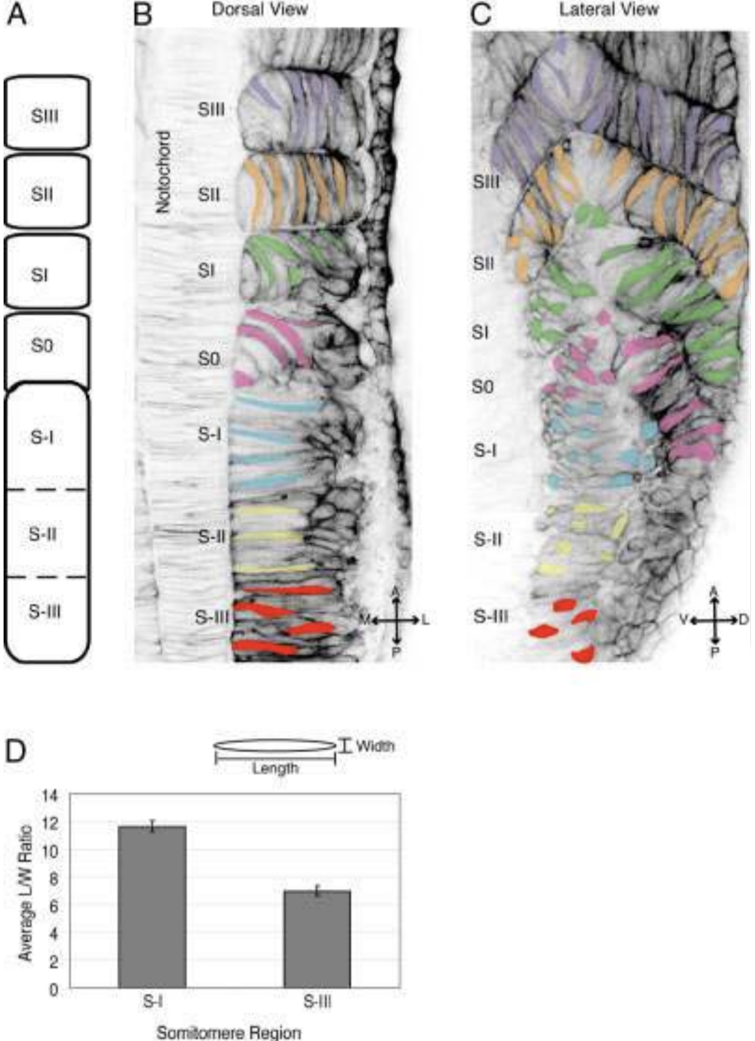 Fig. 1. Cell shapes associated with somite segmentation and rotation.A: A schematic of the paraxial mesoderm indicating the nomenclaturefor prospective somites in the presomitic mesoderm (PSM) and recentlyformed somites. B: A dorsal scan of a fixed and cleared stage 24 embryoinjected with mRNA encoding GAP43-GFP captured on a confocal mi-croscope. C: A lateral scan of another embryo at the same stage. Imageswere captured with the embryo’s anterior end oriented toward the top ofthe image and dorsal end toward the right of the image. D: A graphrepresenting the length/width ratio of cells located in S-I (n ⫽ 40 cells)and S-III (n ⫽ 40 cells) regions of the PSM. GFP, green fluorescentprotein.