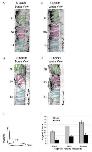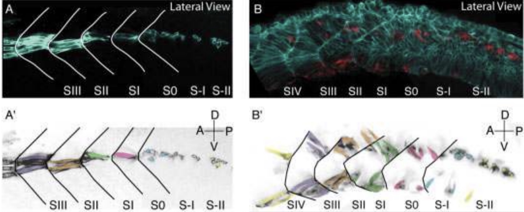 Fig. 3. Somite rotation consists of the move-ments of cells around the dorsoventral axis. A:Lateral view of a ï¬xed and cleared stage 28 embryo that was labeled with green fluorescent protein (GFP) in the B1 blastomere at the 32-cell stage. The subset of labeled cells is positioned in the central region of the presomitic mesoderm (PSM) and in mature somites. A: The same image as shown above, but pseudo-colored to highlight the relative position of cells located within the central region of the paraxial mesoderm along the length of the anteroposterior axis. B: Lateral view of a ï¬xed and clearedstage 24, GFP-labeled embryo, which receiveda transplant of Mini-Ruby (molecular probes)-labeled cells, seen in red. Bâ´: The same image,inverted, where the Mini-Ruby cells have beenindividually pseudocolored. A clonal populationof cells remains restricted to the dorsal or ven-tral portions of the PSM (S-I blue, S-II, yellow)and in more advanced somites (S0 to SIV). Forall panels, anterior is to the left and dorsal is tothe top.