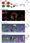Fig. 2. Cells maintain an elongated cell shape during rotation. A: Anillustration of the transplant procedure used to obtain the images in B, C,and D. Host embryos received transplantations of rhodamine- and flu-orescein dextran-labeled cells and were allowed to develop to stage 28and then were fixed and cleared for image analysis. B: The resultingembryo exhibited a mixture of red and green fluorescent cells scatteredthroughout the paraxial mesoderm. The z-stack collected from thisimage was rendered into a three-dimensional (3-D) image using theAmira software package. C: A lateral view of the 3-D image reveals thatcells in the dorsal portion of S0 complete rotation before cells positionedin other regions of the same somite. D: A ventral view of the same imageshows that cells maintain an elongated shape as they bend toward theanterior and posterior directions during rotation.
