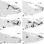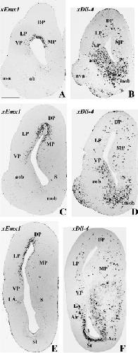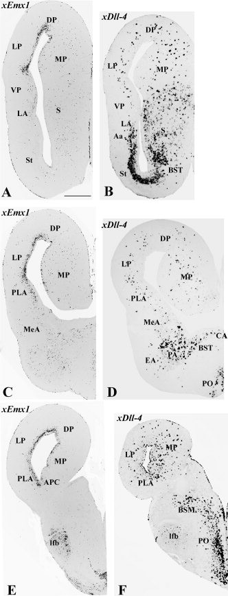 Figure 6. Frontal paraffin sections through the telencephalon of an adult Xenopus, from intermediate (top) to caudal (bottom) levels, hybridized for xEmx1 (A,C,E) or xDll4 (B,D,F). Note the strong xEmx1 expression in the majority of the pallium (specially in the dorsal and lateral divisions) except for the ventralpallium. Only a few xEmx1-expressing cells are observed in the VP mantle. In the pallium, including the ventralpallium, only some scattered mantle cells express the subpallial marker gene xDll4, and these are probably immigrant cells of subpallial origin. The caudal part of the lateral amygdalar nucleus, here called the posterolateral amygdalar nucleus (PLA), is rich in xEmx1 expression and may be a lateral pallial derivative. On the other hand, the medial amygdalar nucleus is poor in both xEmx1 and xDll4, and at least a major part of it may be a ventral pallial derivative. See text for more details. For abbreviations , see list. Scale bar = 200 μm in A (applies to all).