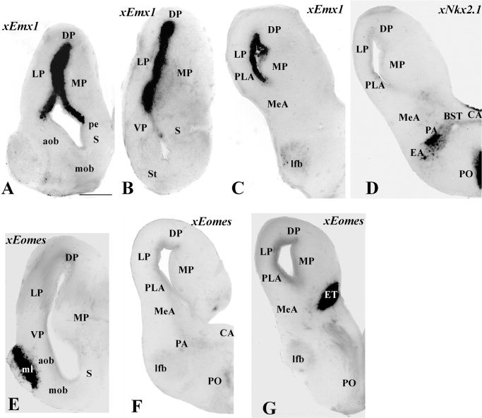 Figure 4. Frontal thick sections through the telencephalon of adult Xenopus, from rostral (left) to caudal (right) levels, hybridized for xEmx1 (AâC), xEomes (EâG), or xNkx2.1 (D). Note the strong periventricular expression of xEmx1 in the majority of the pallium (medial, dorsal, and lateral divisions), except the ventralpallium (VP; AâC). The posterolateral amygdalar nucleus (PLA) also shows strong xEmx1 signal (C). Strong xEomes expression is observed in the mitral cell layer of the olfactory bulb (ml; E), as well as in the eminentia thalami (ET; G). However, this gene is apparently downregulated in the pallium of the adult frog (EâG). Note the expression of xNkx2.1 in the pallidal telencephalic domain of adult Xenopus (D), and also note that a major part of the medial amygdalar nucleus does not show any periventricular xNkx2.1 signal. See text for more details. For abbreviations , see list. Scale bar = 200 μm in A (applies to all).
