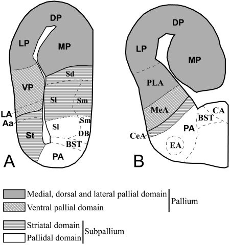 Figure 7. Schematics of frontal sections through the telencephalon of adult Xenopus, at intermediate (A) or caudal (B) levels, showing some of the major telencephalic divisions (pallium, subpallium) and subdivisions (striatum and pallidum in the subpallium; ventral pallium in the pallial domain), and the nuclei or areas included in them, as inferred from the expression patterns of several homeobox genes during development and in the adult. In frogs, the ventral pallium appears to include the postolfactory eminence (in the rostral septum), the ventral part of the classical lateral pallium, and some amygdalar nuclei, such as the lateral amygdalar nucleus (LA) and a major part of the medial amygdalar nucleus (MeA). The frog posterolateral amygdalar nucleus appears to belong to the lateral pallium. As in amniotes (Puelles et al., 2000), expression patterns of xDll4 and xNkx2.1 indicate that striatal-like and pallidal-like molecular subdivisions of the subpallium are found in the lateral telencephalic wall (including the basal ganglia and part of the amygdala) as well as in the septum of frogs (González et al., 2002a, b; Broxet al., 2003). In the subpallial amygdala, the so-called anterior and central amygdalar nuclei of frogs appear to belong to the striatal domain (Broxet al., 2003). On the other hand, a small part of the frog MeA may belong to the subpallium (maybe including a pallidal part; González et al., 2002a, b; Moreno and González, 2003). Thus, as in amniotes (Puelles et al., 2000), the amphibian amygdala appears to consist of lateral pallial, ventral pallial, striatal, and possibly pallidal subdivisions. See text for more details. For abbreviations , see list.