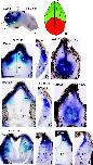 Figure 1. A: Lateral view of a whole-mount brain of a Xenopus embryo at stage 33â34, hybridized for xDll4. The red dashed lines represent the horizontal section plane and level of the sections shown in panels BâL (a, telencephalic level, similar to those shown in panels BâE and IâJ; b, section through the preoptic region [PO] and eminentia thalami [ET], similar to those shown in FâH and KâL). B: Schema of a horizontal section through the embryonic telencephalon of Xenopus showing the major telencephalic divisions based on the gene expression patterns shown in panels CâE. CâE,I,J: Horizontal sections through the telencephalon of Xenopus embryos at stages 33â34 (E), 35â36 (C,D), or 37â38 (I,J), hybridized for xEomes (C,I), xEmx1 (D,J) or xDll4 (E). Note the broad expression of xEomes in the pallium (P; in proliferating and postmitotic cells), which is complementary to that of xDll4 in the subpallium (SP; C,E). xEmx1 is also broadly expressed in the majority of the pallium, except for a ventral pallial area (ventralpallium or VP) that contains only xEmx1-expressing cells in the mantle (D, J). The ventralpallium shows the strongest xEomes expression (C,I). In addition to the expression of xEomes and xEmx1 in the pallium, signal of these genes is observed in the subpallial mantle and may represent immigrant cells coming from the pallium. FâH,K,L: Horizontal sections through the PO and ET of Xenopus embryos at stages 33â34 (H), 35â36 (F,G), or 37â38 (K,L), hybridized for xEomes (F,K), xEmx1 (G,L), or xDll4 (H). Note the strong expression of pallial marker genes in the ET and the absence of xDll4 expression in this region. Asterisks in J and L represent an artifact. See text for more details. For abbreviations , see list. Scale bars = 100 μm in A; 50 μm in C (applies to CâL).