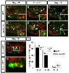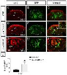 Figure 7. mZac1c promotes apoptosis in Xenopus retina at stage 32. A�F: Stage 32 control green fluorescent protein (GFP, A�C) and Zac1+GFP�injected (D�F) retinae labeled with anti�activated caspase-3 (ac-3, red, A,C,D,F) and GFP epifluorescence (green, B,C,E,F). The insert in F shows a high-magnification image, and arrowheads in F show GFP/ac-3 double positive cells. G�I: Stage 40 Zac1+GFP�injected retinae labeled with ac-3 (red, G,I) and GFP epifluorescence (green, H, I). J: Quantification of apoptotic control and Zac1-misexpressing cells in stage 32 retinae. n refers to the number of retinae examined, and total cells counted were control (n = 2,115) and Zac1 (n = 1,705). Error bars are SEM. *P < 0.05. gcl, ganglion cell layer; inl, inner nuclear layer; onl, outer nuclear layer; vz, ventricular zone. |