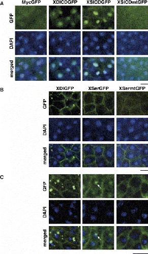 was stained with DAPI. (A) XDICDGFP and XSICDGFP are strongly localized in the nucleus, but not MycGFP and XSICDmtGFP mutated in the