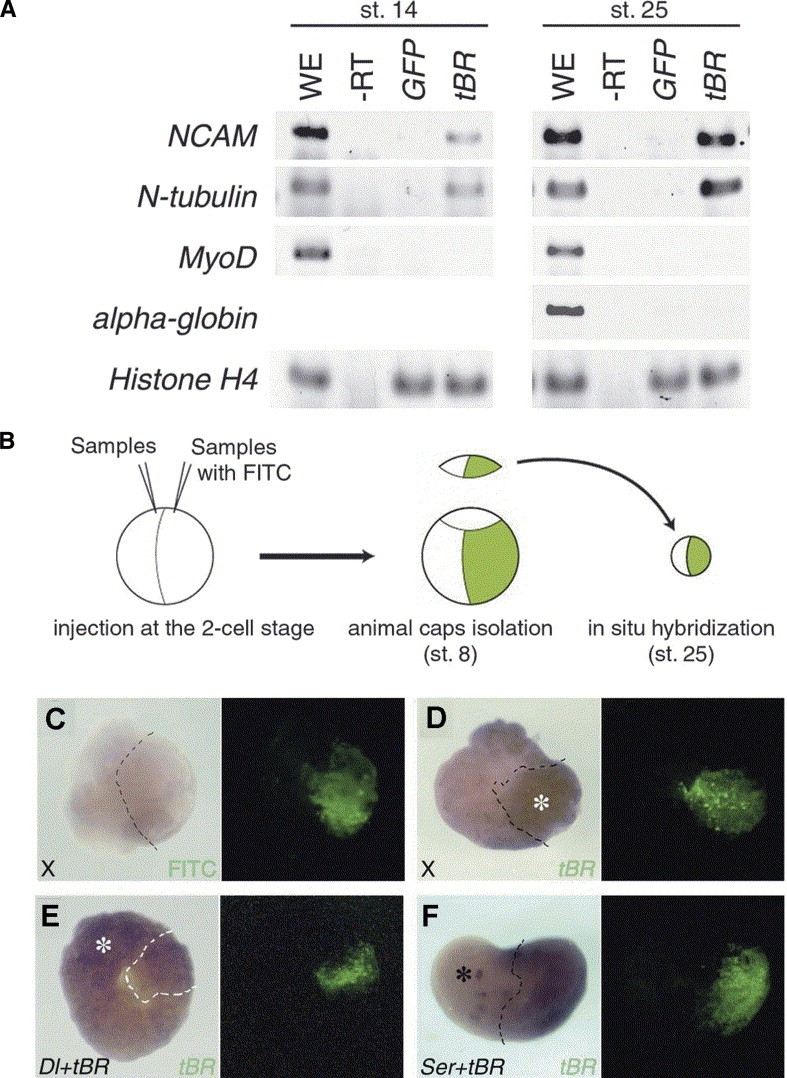 induction of N-tubulin-expression (asterisk). (E) Injection of tBR and X-Delta-1 (Dl) RNA (1 ng). Expression of N-tubulin occurs in the X-Delta-1-injected