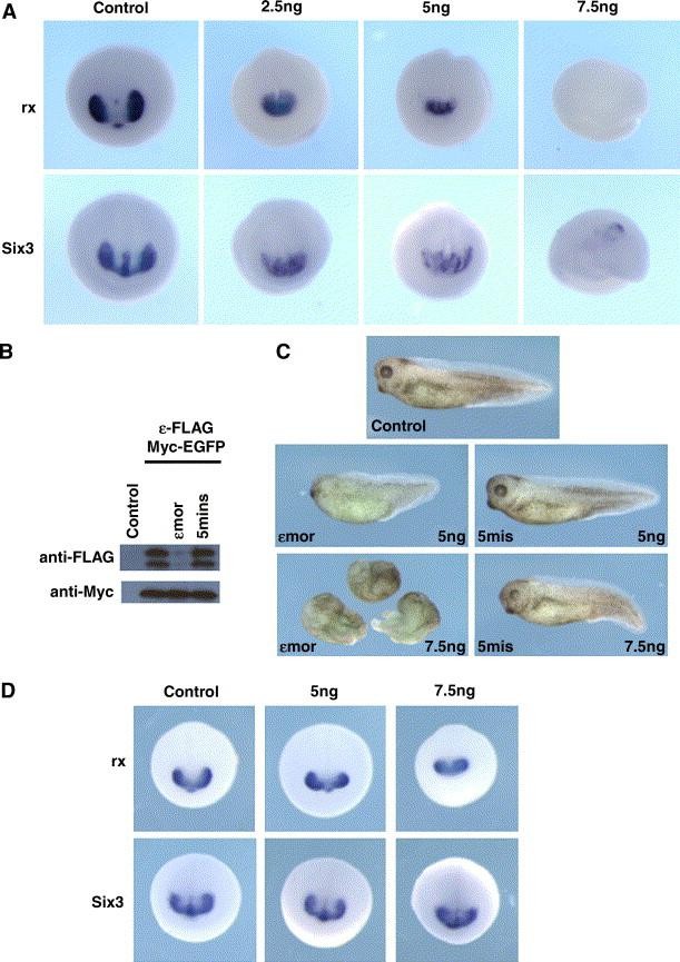 Fig. 1. Dose-dependent effects of B56ε depletion on eye development. (A) Whole mount in situ hybridization showing the expression of rx (upper panels) and six3 (lower panels) in stage 20 control embryos, 2.5 ng εmor injected embryos, 5 ng εmor injected embryos, and 7.5 ng εmor injected embryos. εmor was injected into two dorsal animal blastomeres at the 8-cell stage. (B) Western blot showing the effects of εmor and 5mis on the translation of B56ε-FLAG. Myc-EGFP was used as a control for injection and loading. Morpholinos (5 ng) were injected into one of the dorsal animal blastomere at the 8-cell stage. Subsequently, a mixture of B56ε (200 pg) and Myc-EGFP (50 pg) was injected into the same blastomere. Injected embryos were harvested at the late gastrula stage. (C) Whole embryo phenotypes at the tadpole stage showing the effect of morpholinos injection on early embryonic development. Embryos were either uninjected (top), or bilaterally injected with εmor (5 ng, middle left; 7.5 ng, lower left), or injected with 5mis (5 ng, middle right; 7.5 ng, lower right) into both dorsal animal blastomeres at the 8-cell stage. (D) Whole mount in situ hybridization showing the expression of rx (upper panels) and six3 (lower panels) in stage 18 control embryos, 5 ng of 5mis injected embryos, and 7.5 ng of 5mis injected embryos. 5mis was injected into two dorsal animal blastomeres at the 8-cell stage. Note that less than 30% of embryos injected with 7.5 ng of 5mis exhibited fused rx or six3 expression at this stage. The rest of embryos were normal (not shown). |