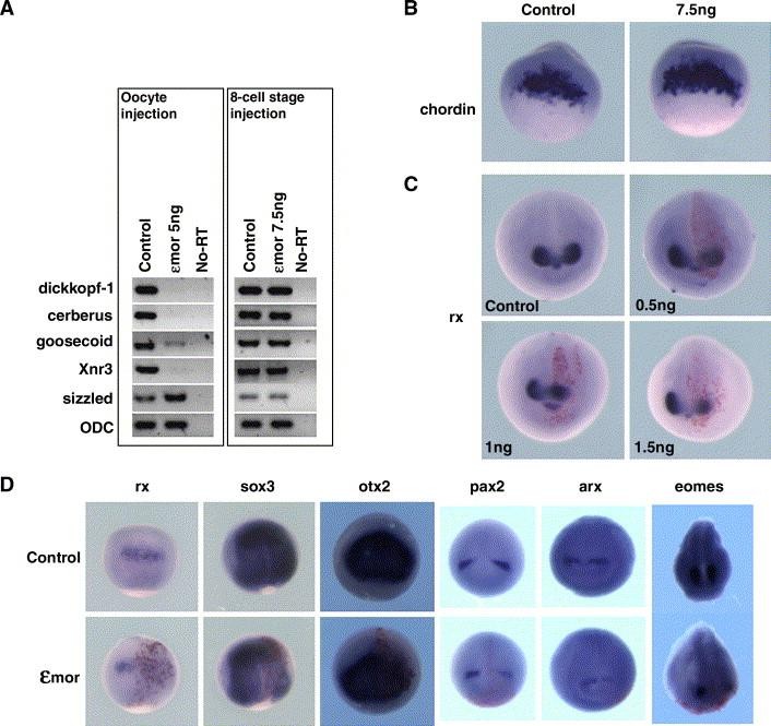 Fig. 2. B56ε plays a direct role in the regulation of rx expression. (A) RT-PCR showing that maternal depletion of B56ε (oocyte injection) reduced the expression of dorsal specific genes (dickkopf-1, goosecoid, cerberus, and Xenopus nodal related3 (xnr3)) and enhanced the expression of a ventral-specific gene (sizzled) at stage 11. Injection of 7.5 ng of εmor into two dorsal animal blastomeres at the 8-cell stage did not affect the expression of above genes. ODC was used as the loading control. (B) Whole mount in situ hybridization showing that the expression of chd in a control embryo and an embryo injected with 7.5 ng of εmor. (C) Whole mount in situ hybridization showing the expression of rx in a stage 18 uninjected embryo, an embryo injected with 0.5 ng of εmor, an embryo injected with 1 ng of εmor, and an embryo injected with 1.5 ng of εmor. εmor was injected into one of A1 blastomeres at the 32-cell stage. Lineage tracer, n-β-gal, was co-injected with εmor to indicate the side of injection. (D) Whole mount in situ hybridization showing the expression of rx (stage 12.5), sox3 (pan-neural, stage 12.5), otx2 (pan-forebrain, stage 12.5), and pax2 (midbrain, stage 14), arx (diencephalons, stage 14), and eomesodermin (telencephalon, stage 26/27) in control embryos (upper panels) and embryos injected with εmor (4.5 ng, lower panels). The right side was injected as indicated by the Red-gal staining. Embryos were injected unilaterally at the 8-cell stage. |