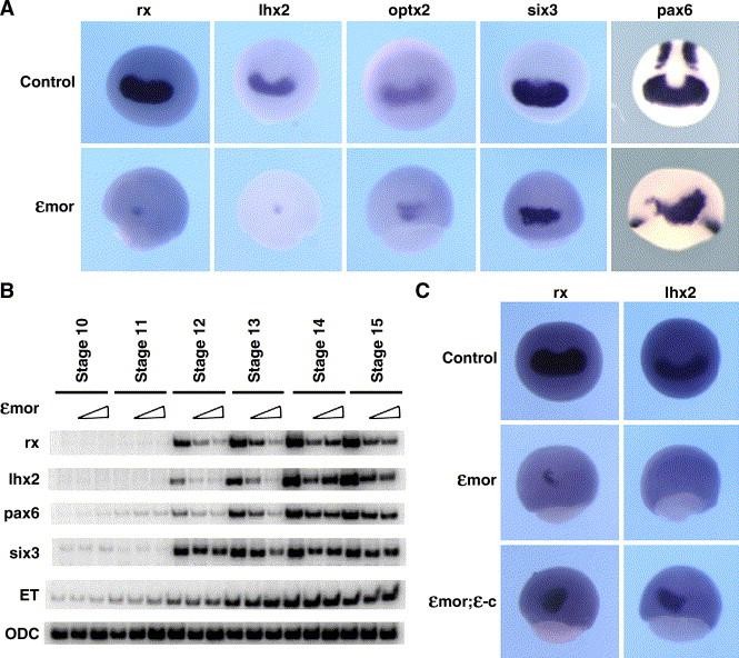 Fig. 3. B56ε is required for the induction of a subset of EFTFs. (A) Whole mount in situ hybridization showing the expression of rx, lhx2, optx2, six3, and pax6 in stage 14 uninjected embryos (upper panels) and embryos bilaterally injected with 7.5 ng of εmor (lower panels). (B) RT-PCR showing the expression of rx, lhx2, pax6, six3, and ET in control embryos, embryos bilaterally injected with 5 ng or 7.5 ng of εmor from stage 10 (the beginning of gastrulation) to stage 15 (mid-neurula stage). ODC was used as loading control. (C) Whole mount in situ hybridization showing the expression of rx (left column) and lhx2 (right column) in stage 14 uninjected embryos (upper panels), embryos injected with εmor (7.5 ng, middle panels), and embryos injected with εmor (7.5 ng) and ε-c (100 pg) (lower panels). Both dorsal animal blastomeres were injected at the 8-cell stage. Morpholino and ε-c were injected sequentially. Note that the expression of rx and lhx2 was partially rescued by ε-c. |