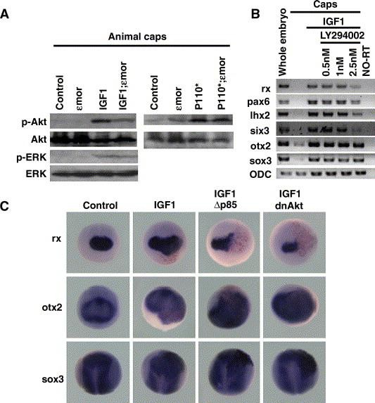 Fig. 5. The PI3K/Akt pathway is required for IGF1-induced EFTFs. (A) Western blot showing that εmor injection blocked Akt phosphorylation induced by IGF1, but had no effect on Akt phosphorylation induced by P110. In addition, εmor had no effect on IGF1-induced ERK phosphorylation. εmor (10 ng) and RNA encoding IGF1 (2 ng) or P110 (1 ng) were injected sequentially, with εmor being injected at the 1-cell stage and RNAs being injected at the 4-cell stage. Animal caps were dissected at stage 8/9 and harvested at stage 13. (B) RT-PCR results showing LY294002, a PI3K inhibitor, blocked IGF1-induced expression of rx, lhx2, pax6, and six3, without affecting IGF1-induced otx2 and sox3 expressions in animal cap assay. IGF1 was injected as described above. Caps were dissected at late blastula stage and harvested at stage 13. Some caps were exposed to LY294002 from stage 9. (C) δp85 (2 ng) and dnAkt (2 ng) blocked IGF1 (2 ng) induced rx (upper panels), but not IGF1-induced otx2 (middle panels) and sox3 (lower panels) in whole embryos. One of the dorsal animal blastomeres was injected at the 8-cell stage. The right side was injected. |