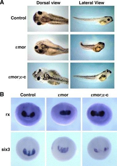 Fig. 7. B56ε is required for eye field separation. (A) Dorsal (left column) and lateral (right column) views of an uninjected embryo (upper panels), an embryo injected with εmor (3.5 ng) (middle panels), and an embryo injected with εmor and ε-c (100 pg) (lower panel). (B) The expression of rx (upper panels) and six3 (lower panels) in stage 18 control embryos (left column), embryos injected with εmor (middle column), and embryos injected with εmor and ε-c (right column). Embryos were bilaterally injected at the 8-cell stage. |