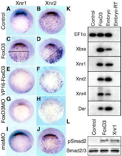 Fig. 7. FoxD3 is necessary and sufficient for Nodal expression. At the early gastrula stage, Xnr1 (A) and Xnr2 (B) are expressed in two distinct domains: strong expression in the dorsal marginal zone and punctate expression throughout the vegetal pole. In the experiment shown, vegetal expression is more apparent for Xnr2. For FoxD3 gain-of-function, 200 pg of FoxD3 RNA was injected into the marginal region of two blastomeres at the four-cell stage and the expression of Xnr1 (C) and Xnr2 (D) was examined by in situ hybridization at the early gastrula stage (stage 10.25). Ectopic expression of Xnr1 and Xnr2 is indicated with brackets. For FoxD3 loss-of-function, 0.5 ng of VP16-FoxD3 (E,F) or 25 ng of FoxD3MO (G,H) was injected into each blastomere at the four-cell stage and the expression of Xnr1 and Xnr2 was examined. As a negative control, 25 ng of mismatch MO (I,J) was injected. The results shown are representative of three independent experiments (n=20-25 embryos per sample in each experiment). Vegetal views with dorsal side up are shown. (K) At the one-cell stage, the animal pole was injected with FoxD3 RNA (300 pg) and animal explants prepared at the blastula stage (stage 9) were analyzed by RT-PCR at the early gastrula stage (stage 10.25) for the expression of Brachyury (Xbra), Xnr1, Xnr2, Xnr4 and Derriere (Der). PCR controls are as described in Fig. 2. (L) Lysates of FoxD3- or Xnr1-expressing animal explants were examined for the presence of phospho-Smad2 protein by western blotting with a phospho-specific anti-Smad2 antibody. Stripped blots were analyzed for total Smad2/3 proteins as a loading control. |