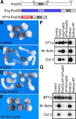 Fig 3. Functional analysis of FoxD3 fusion proteins. (A) Schematic of the structure of FoxD3 and the FoxD3 fusion proteins. FoxD3 contains a conserved winged helix (WH) DNA-binding domain (residues 92-192). The repressor fusion protein (Eng-FoxD3) contains the repressor domain of Drosophila Engrailed (residues 1-298) fused to the FoxD3 WH domain. The activator fusion protein (VP16-FoxD3) contains the activation domain of HSV VP16 (residues 410-490). Embryos were injected with FoxD3 (100 pg), Eng-FoxD3 (100 pg) or VP16-FoxD3 (250 pg) and animal explants were analyzed at the tailbud stage (stage 25) for morphogenesis (B-E) and by RT-PCR for the expression of Muscle Actin (M. Actin) and Collagen Type II (Col II) (F). Like FoxD3, Eng-FoxD3 induced convergent extension movements and mesodermal gene expression, whereas VP16-FoxD3 did not. (G) Co-expression of VP16-FoxD3 and FoxD3 blocked induction of mesodermal genes by FoxD3. PCR controls are as described in Fig. 2. |