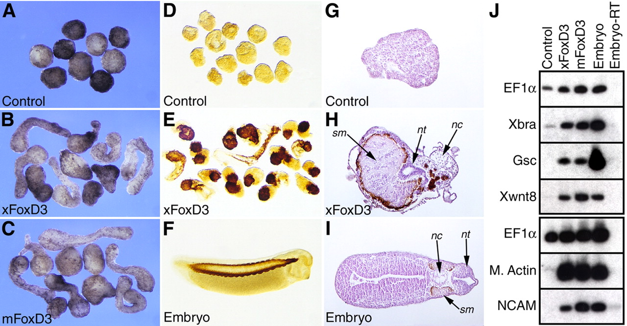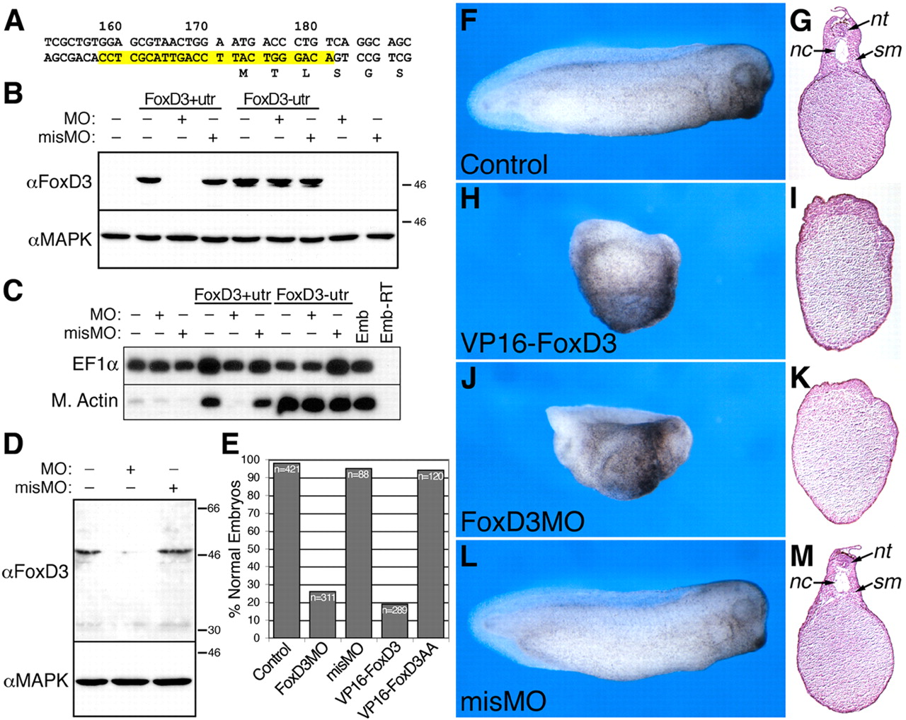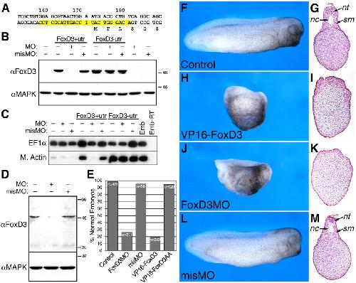 Fig 4. FoxD3 function is required for axis formation. (A) The sequence of FoxD3 flanking the initiator methionine with the sequence of the morpholino antisense oligonucleotide (181-158) highlighted in yellow. (B) Western analysis of animal explants prepared from embryos injected with FoxD3 RNAs (2 ng) alone, or in combination with antisense (FoxD3MO) or mismatch (misMO) morpholino oligonucleotides (50 ng). Translation of a FoxD3 RNA containing the 5â²UTR and the complete antisense target sequence (FoxD3+utr) was inhibited by FoxD3MO, but not misMO. Translation of FoxD3 lacking the 5â²UTR (FoxD3-utr) was unaffected by either oligonucleotide. Equal protein loading was confirmed by blotting for the ubiquitous MAPK. (C) RT-PCR analysis of Muscle Actin (M. Actin) induction in animal explants injected with FoxD3 RNAs containing or lacking the 5â²UTR (200 pg) and FoxD3MO or misMO (50 ng). PCR controls are as described in Fig. 2. (D) At the four-cell stage each blastomere was injected in the marginal zone with FoxD3MO or misMO (25 ng), and extracts prepared at the midgastrula stage (stage 11) were analyzed by western blotting for the accumulation of endogenous FoxD3 protein. A single major band, migrating at the same position as overexpressed Xenopus FoxD3, was detected in uninjected and misMO-injected samples, and was reduced â¼tenfold in FoxD3MO-injected samples. The exposure of the western blot in panel D was approximately eight times longer than that shown in panel B. (E-M) At the four-cell stage each blastomere was injected in the marginal zone with 250 pg of VP16-FoxD3 RNA (H,I), 15 ng of FoxD3MO (J,K) or 15 ng of misMO (L,M). At the tailbud stage (stage 30), embryos were sectioned (transverse, dorsal up) to examine the formation of axial structures, including notochord (nc), somitic muscle (sm) and neural tube (nt) (G,I,K,M). (E) Quantification of the combined results of five independent experiments. |