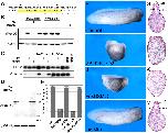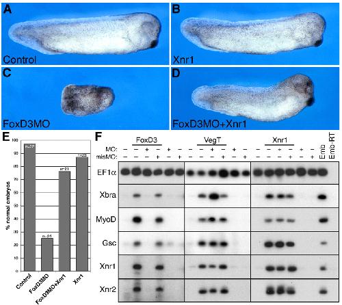Figure 8. FoxD3 acts upstream of Nodal in axis formation and mesoderm induction. (A) Control. At the four-cell stage, both dorsal blastomeres were injected with FoxD3MO (25 ng) alone (C), or in combination with 10 pg of Xnr1 RNA (D). At the dose used, injection of Xnr1 alone (B) did not perturb axis formation in most embryos. (E) Quantification of a representative experiment. (F) To assess the dependence of Xnr1 and VegT activity on FoxD3, the animal pole was injected at the one-cell stage embryo with VegT (500 pg) or Xnr1 (100 pg) alone, or in combination with FoxD3MO or mismatch MO (50 ng). Animal explants were analyzed by RT-PCR at the gastrula stage (stage 11) for the expression of Brachyury (Xbra), MyoD, Goosecoid (Gsc), Xnr1 and Xnr2. As controls, the oligonucleotides were injected alone or in combination with FoxD3 RNA (300 pg). PCR controls are as described in Fig. 2. |