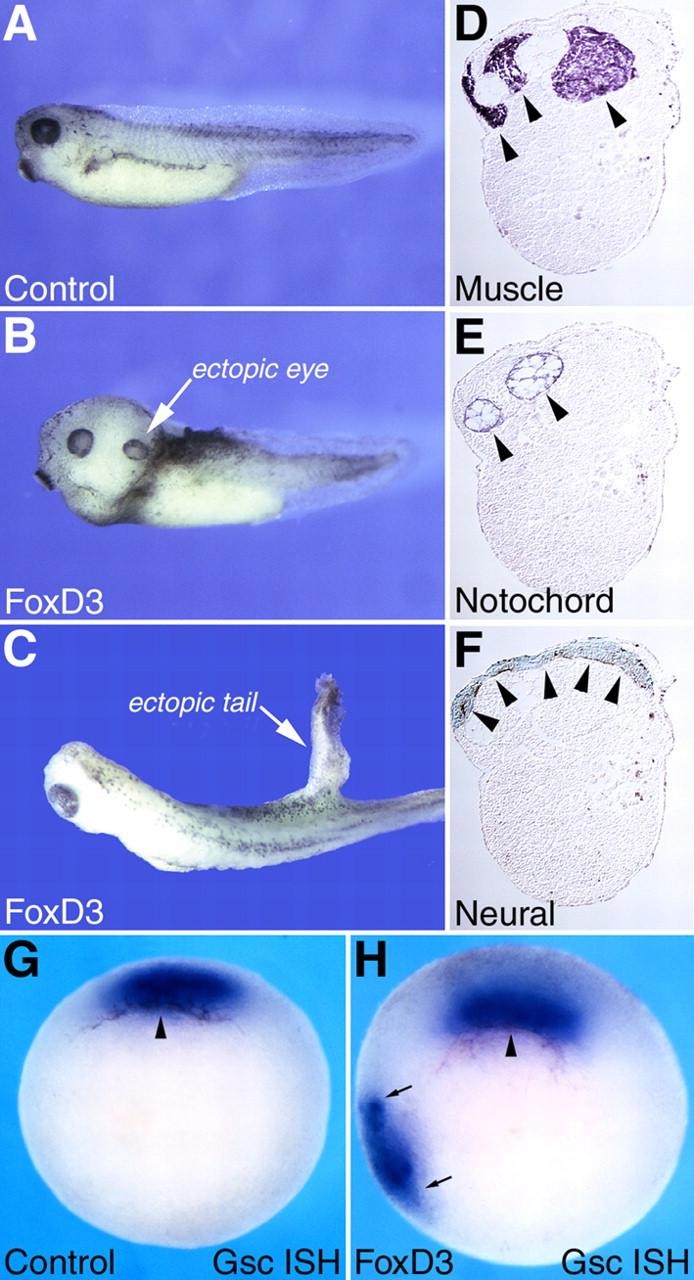 Fig. 1. Ectopic axis induction by FoxD3. (A) Control. At the four-cell stage a single ventral blastomere was injected with FoxD3 RNA (100 or 300 pg). Ectopic anterior axial structures, including ectopic eyes, were induced at the high dose (B) and ectopic tails were induced at the low dose (C). Embryos were analyzed at stage 35 by serial-section immunocytochemistry to detect muscle (12/101) (D), notochord (Tor70) (E) and neural tube (4d) (F) (transverse sections, dorsal up; arrowheads indicate stained tissues). Embryos were also analyzed at the early gastrula stage (stage 10.25) by whole-mount in situ hybridization for the expression of Goosecoid (G,H). FoxD3 induced ectopic Goosecoid expression (H) (vegetal views, dorsal up; arrowheads indicate dorsal blastopore lip and arrows indicate region of ectopic gene expression). |